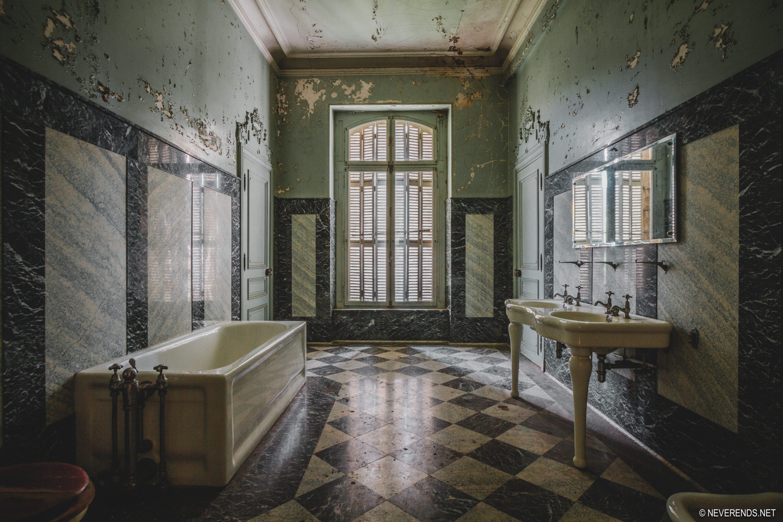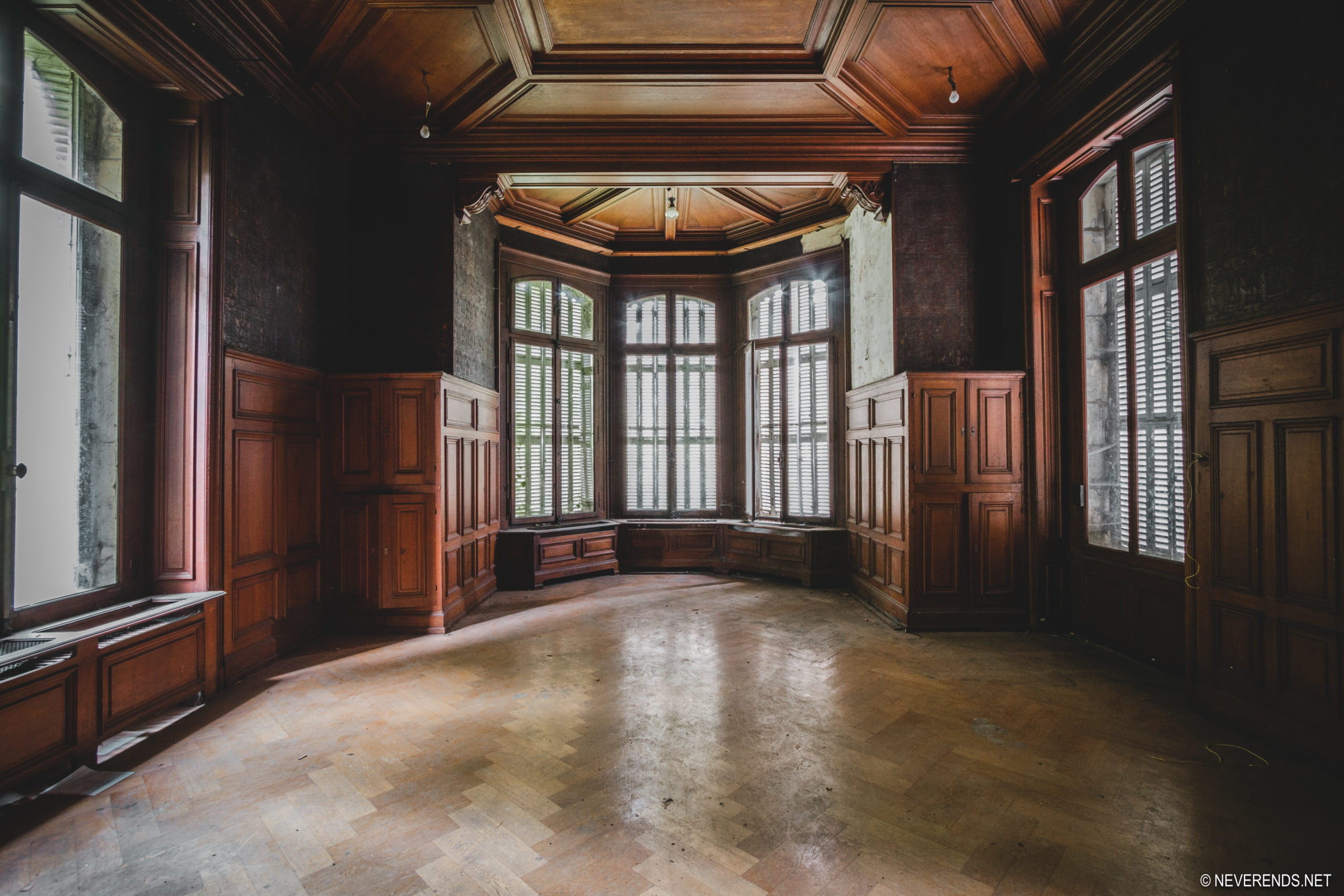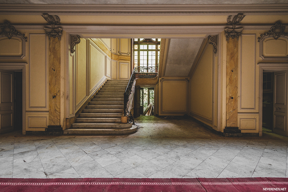 Ce lieu est assez cher à mon cœur. C’est la dernière exploration que j’ai réalisée en présence d’un ami explorateur aujourd’hui décédé, Mathieu Ritter. Ce jour-là nous étions un petit groupe. On descend par un talus abrupt pour se retrouver derrière le château. La porte est ouverte et l’on découvre ce magnifique château. A cette époque le miroir est encore présent et renvoie le reflet de l’immense hall. La lumière est magique venant du plafond grâce à la verrière.