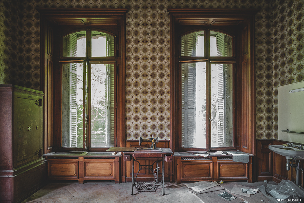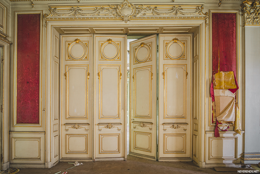 Visité en 2013, ce lieu m’a inspiré photographiquement. Empreint de solitude, les volets fermés cachent ce qui reste de ce château et de son faste d’autrefois. La salle rouge particulièrement, avec ses dorures, tapisseries et colonnes en marbre. Le délabrement ne peut cacher la grandeur et l’opulence de cette salle.